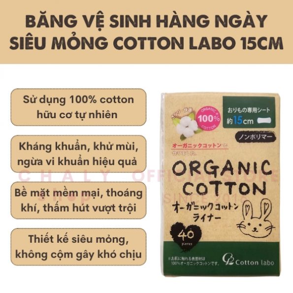 Băng vệ sinh hàng ngày Organic Cotton siêu mỏng Cotton Labo Nhật là băng vệ sinh phụ nữ dùng hàng ngày được sản xuất hoàn toàn với 100% bông cotton hữu cơ tự nhiên , không chứa thành phần hóa học, giúp bề mặt mềm mại, thấm hút vượt trội