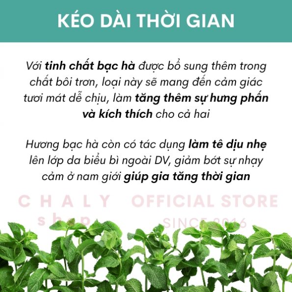 – Với tinh chất bạc hà được bổ sung thêm trong chất bôi trơn, loại này sẽ mang đến cảm giác tươi mát dễ chịu, làm tăng thêm sự hưng phấn và kích thích cho cả hai