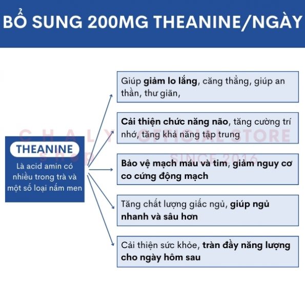 + Để tốt cho giấc ngủ, hàm lượng theanine được khuyến cáo bổ sung hàng ngày là 200mg/ ngày và liên tục trong tối thiểu 6 tuần để đạt hiệu quả rõ rệt