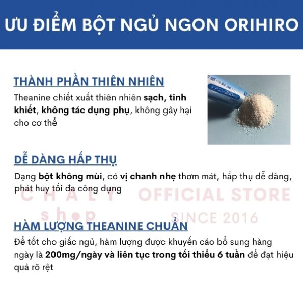 – Thực phẩm chức năng giúp dễ ngủ của Nhật Orihiro tận dụng sức mạnh tự nhiên của thành phần theanine đối với sức khoẻ để đạt được hiệu quả bổ thần kinh giúp ngủ ngon và cải thiện tình trạng mất ngủ