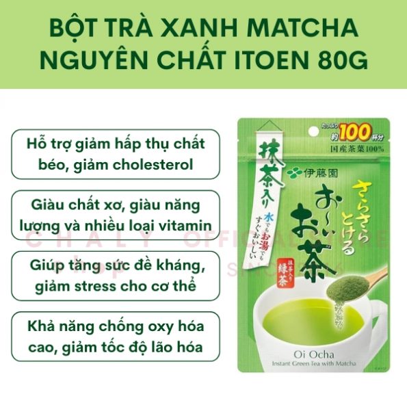 Bột trà xanh matcha nguyên chất Itoen Oi Ocha 80g Nhật là bột trà xanh matcha với hàm lượng chất tannin cao (từ 19% trở lên) giúp chống oxy hóa, kháng khuẩn, giúp cơ thể tăng sức đề kháng, tuổi thọ và giữ gìn được làn da trẻ trung