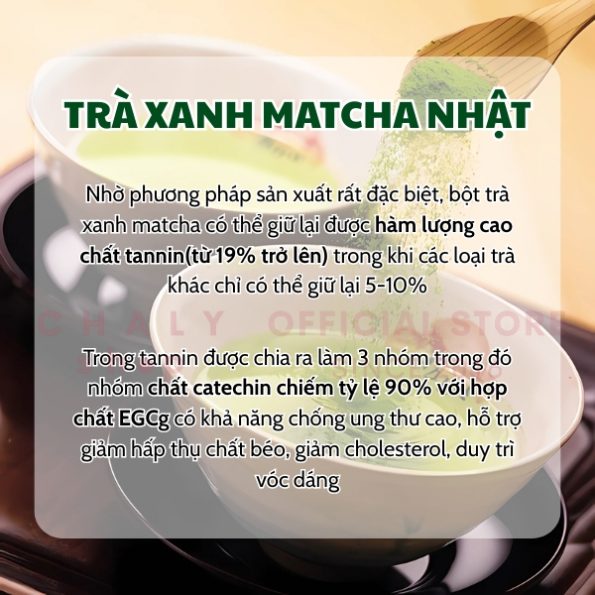 – Nhờ phương pháp sản xuất rất đặc biệt, bột trà xanh matcha Nhật Bản có thể giữ lại được hàm lượng chất tannin nhiều nhất, từ 19% trở lên trong khi các loại trà khác chỉ có thể giữ lại 5-10%. Đây là chất quan trọng nhất của bột trà xanh matcha có tác dụng chống oxy hóa, kháng khuẩn rất mạnh, giúp cơ thể tăng sức đề kháng, tuổi thọ và giữ gìn được làn da trẻ trung