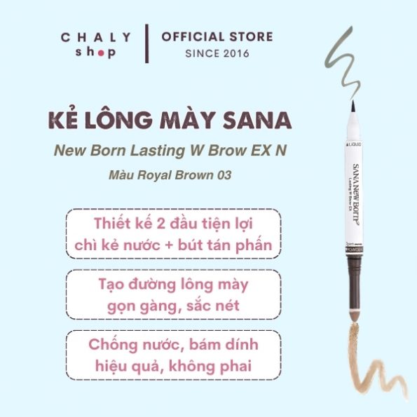 – Cây bút kẻ lông mày tốt như Sana NewBorn Eyebrow Lasting W Brow EX N 2 in1 sẽ là công cụ đắc lực theo suốt chị em trên con đường về sau, giúp bạn sở hữu đôi lông mày gọn gàng, đúng phom với màu sắc hài hoà, tạo điểm nhấn cho gương mặt tươi sáng