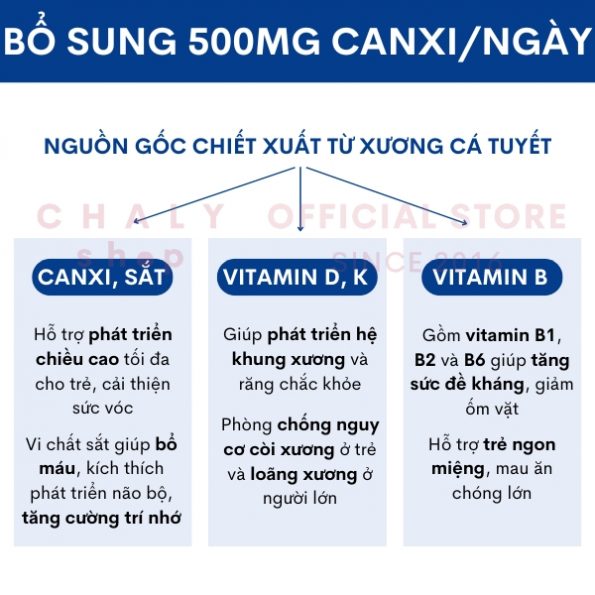 – Ngoài canxi còn bổ sung thêm vitamin D, vitamin K, sắt và các loại khoáng khác, kích thích tối đa sự phát triển chiều cao và trí tuệ ở trẻ