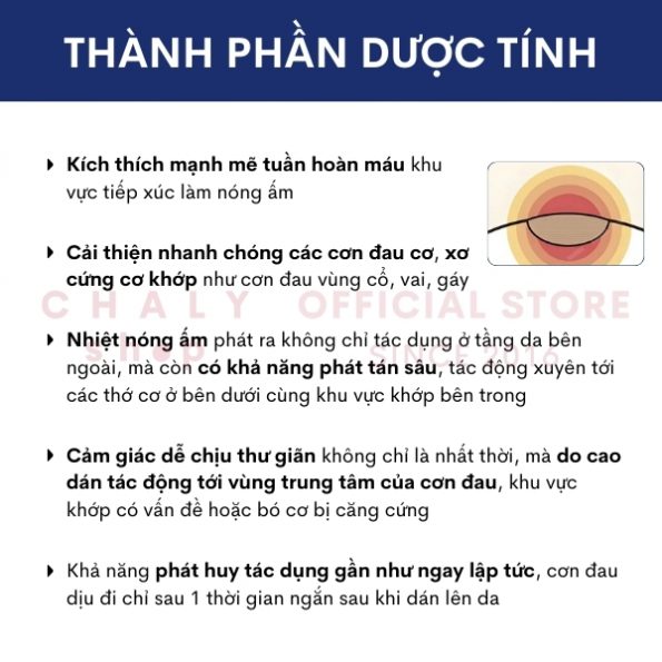 – Chứa thành phần dược tính 4-Hydroxy-3-methoxybenzyl Nonylic Acid Amide có tác dụng kích thích mạnh mẽ tuần hoàn máu khu vực tiếp xúc