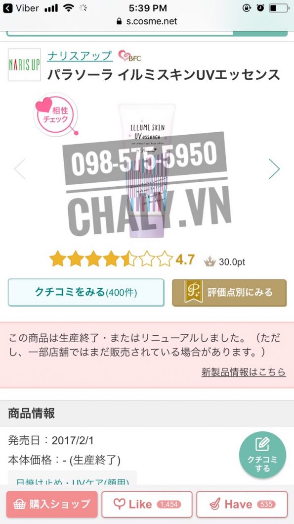 Parasola Illumi Skin UV Essence đứng thứ 2 bảng xếp hạng kem chống nắng tốt nhất tại Cosme Ranking Nhật
