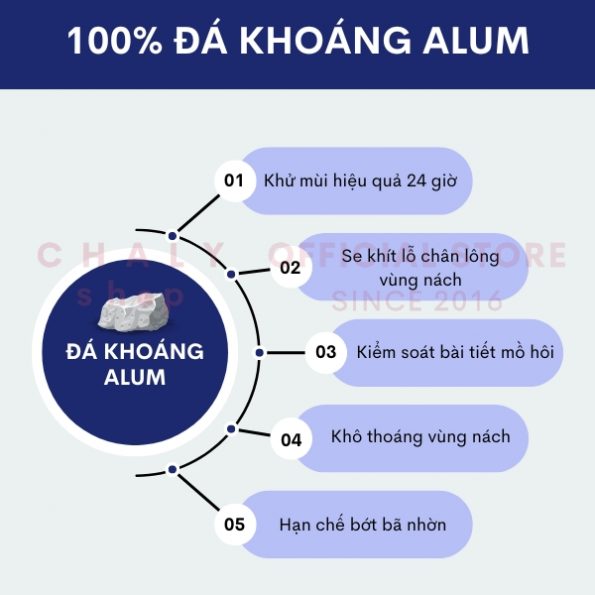 – Thành phần chính là đá khoáng alum độc đáo, có khả năng tiêu diệt vi khuẩn gây mùi, yếm khí vô cùng hiệu quả. Không chỉ thế, alum còn có công dụng se khít lỗ chân lông vùng nách, giảm bài tiết mồ hôi
