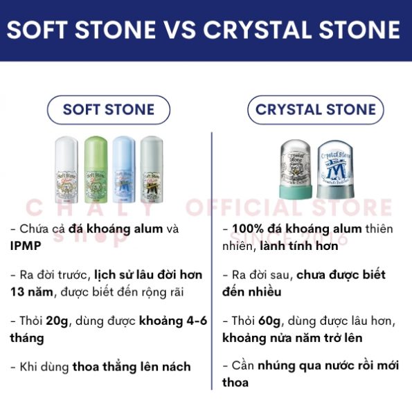 – Nhiều bạn tìm thuốc trị hôi nách của Nhật Bản đã biết tới Crystal Stone và Soft Stone, nhưng không biết nên lựa chọn sản phẩm nào phù hợp hơn. Sau đây là một số so sánh để mọi người tham khảo