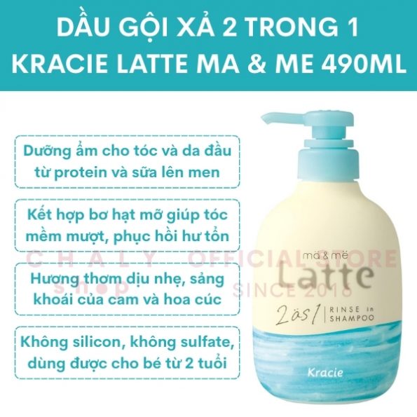 Dầu gội xả 2 trong 1 Kracie Latte Ma & Me 490ml Nhật Bản là dầu gội kiêm dầu xả (2 trong 1) dưỡng tóc suôn mượt cho cả gia đình, dùng được cho bé từ 2 tuổi, và kể cả người có da đầu nhạy cảm