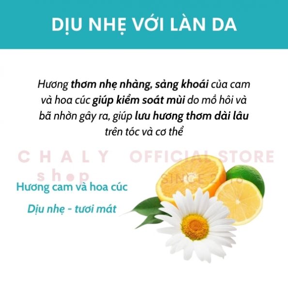 – Hương thơm nhẹ nhàng, sảng khoái của cam và hoa cúc giúp kiểm soát mùi do mồ hôi và bã nhờn gây ra