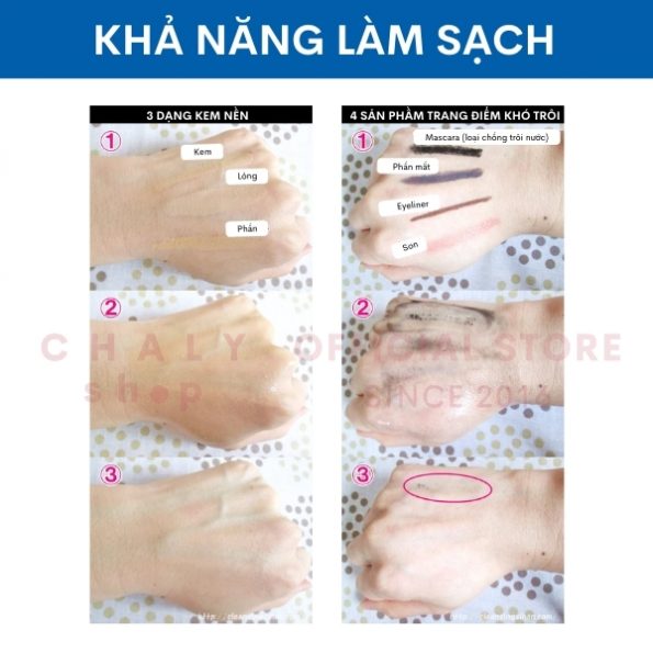– Hiệu quả tẩy trang được review là mạnh. Có thể làm sạch được cả những sản phẩm make up water proof chống nước cứng đầu như mascara, eyeliner