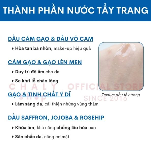 – Tẩy trang sạch sâu giảm mụn Deep cleansing: Rice bran oil, mineral oil, sorbeth-30 tetraoleate, cyclomethicone, orange oil, safflower oil, ascorbyl dipalmitate, tocopherol, jojoba seed oil, rosehip oil, glycerin, corn germ oil, trilaureth-4 phosphoric acid, Water, phenoxyethanol