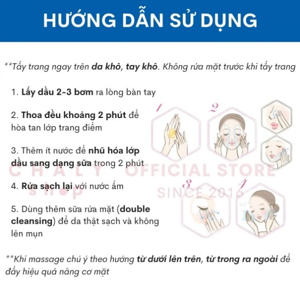 Lấy thật nhiều dầu tẩy trang ra tay, xoa vòng tròn massage thật kỹ trong thời gian lâu thì các bít tắc nơi lỗ chân lông sẽ được lấy đi, làm sạch, cảm giác cực kỳ sảng khoái.