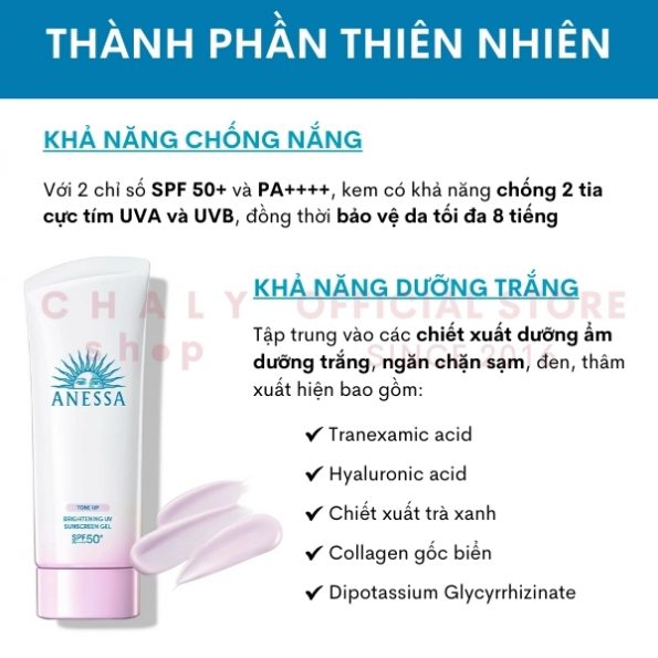 – Không chỉ thế, điểm đặc biệt của kem chống nắng sáng da Anessa Tone Up nằm ở công nghệ sản xuất thành phần “medicated whitening UV gel”, giúp cân chỉnh sắc tố bề mặt da, xoá mờ các vết thâm, sạm, xỉn, cho làn da trắng hồng tự nhiên