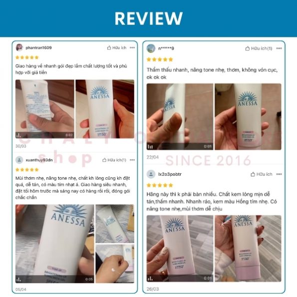 “Mình dùng loại này cũng là tuýp thứ 3 rồi. Kem tệp vào da và nâng tông nhẹ. Dùng ưng lắm, chân ái đây rồi. Vừa làm chống nắng lại vừa làm lớp nền trang điểm luôn được. Nhà nhà dùng của anessa là cũng phải có lý do hết cả ha“