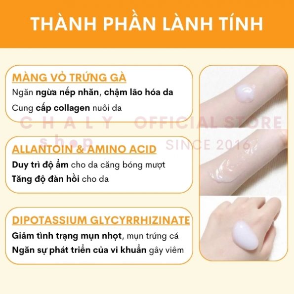 – Phát huy hiệu quả dưỡng ẩm, chống lão hoá, làm mờ nếp nhăn từ thành phần trứng gà độc đáo