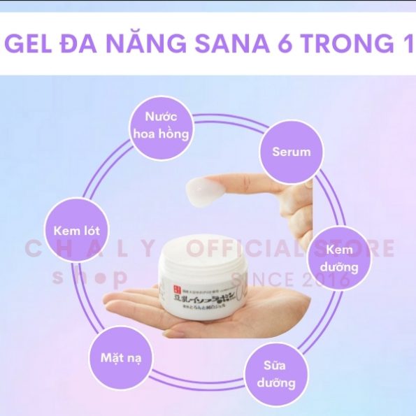 – Gel đậu nành dưỡng trắng da Sana là sản phẩm kem 6 trong 1. Không chỉ thay thế đầy đủ các bước dưỡng da cơ bản từ nước hoa hồng tới mặt nạ, mà Sana whitening gel còn đóng vai trò như một lớp kem lót, giúp kem nền, phấn phủ và kem chống nắng bám vào da tốt và mịn hơn hẳn