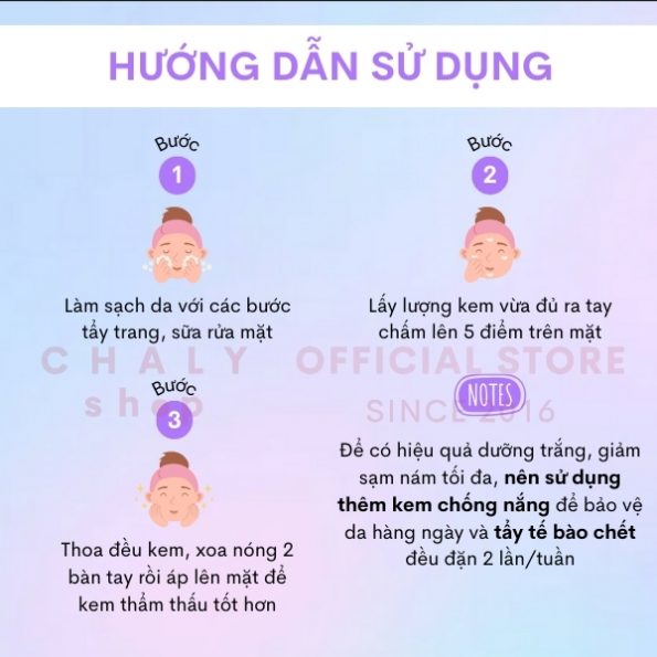 – Mục đích sử dụng: Dưỡng ẩm, trị nám tàn nhang. Trị sạm da. Dưỡng trắng da