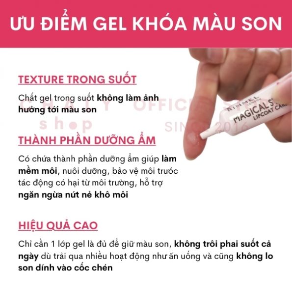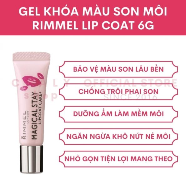 – Sản phẩm giúp tạo lớp gel trong suốt bao phủ lớp son môi bên trong. Vì là gel trong suốt, Rimmel Magical Stay Lip Coat không làm ảnh hưởng tới màu sắc xinh đẹp của son mà ngược lại còn giúp bảo vệ màu son lâu bền, chống trôi phai