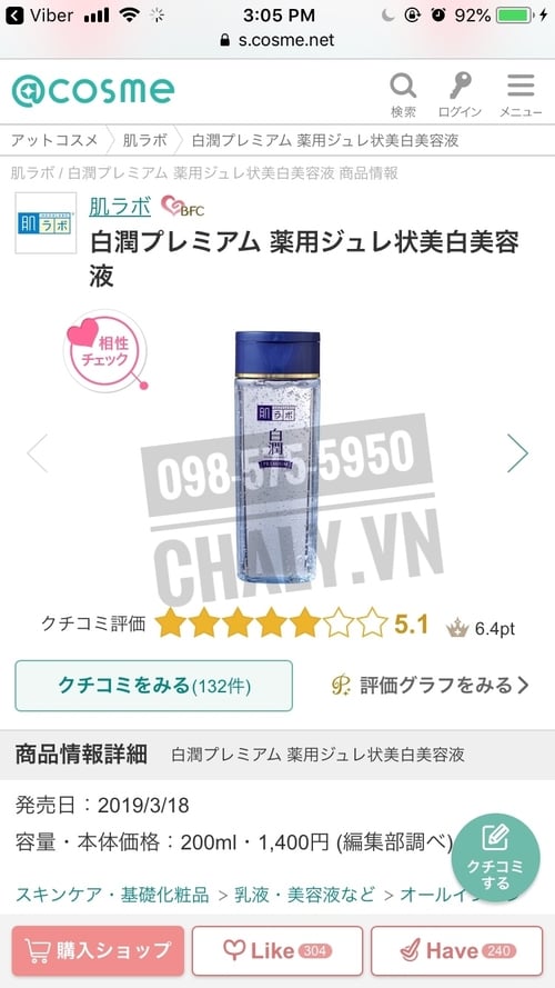 – Thạch dưỡng trắng Hada Labo đạt số điểm review cao 5.1 trên Cosme Nhật Bản