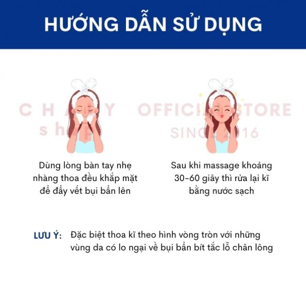– Đặc biệt thoa kĩ theo hình vòng tròn với những vùng da có lo ngại về bụi bẩn bít tắc lỗ chân lông