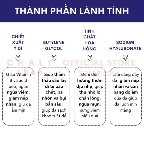 – Butylene Glycol giúp thẩm thấu sâu lấy đi tế bào chết, bã nhờn và bụi bẩn sâu giúp da sạch khoẻ triệt để