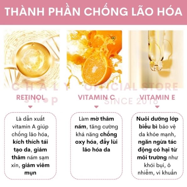 – Thành phần vitamin C giúp làm mờ thâm nám, tăng cường khả năng chống oxy hoá, đẩy lùi lão hoá da