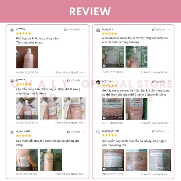 “Mình là da nhạy cảm nên khá kén mỹ phẩm sử dụng. Có những loại tẩy trang mình dùng bị khô và căng da, mua xong vứt đi không thể dùng được nữa. Nhưng tẩy trang rau củ của Vegeskin này thì dùng hợp thực sự. Dùng xong đi thử loại khác rồi cuối cùng vẫn phải quay về với em nó thôi“