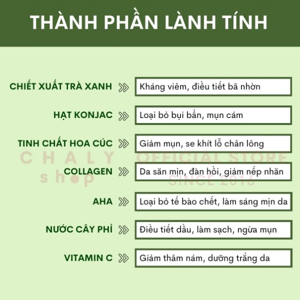 – Mang trong mình thành phần độc đáo là chiết xuất trà xanh Ujicha vùng Kyoto (loại trà xanh cao cấp và nổi tiếng) có khả năng kháng viêm, kiểm soát mụn, điều tiết bã nhờn vô cùng hiệu quả…