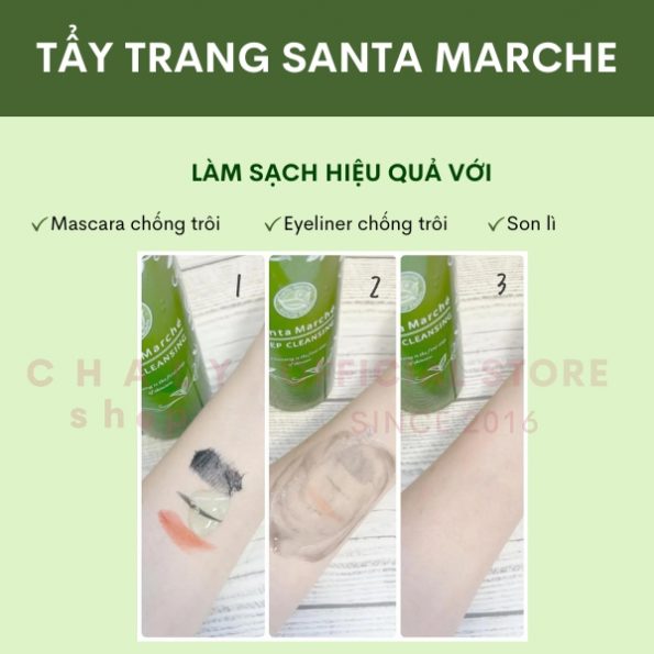 – Tẩy trang trà xanh Santa Marche đầu tiên được review cao bởi khả năng làm sạch lớp make up, kem chống nắng ưu việt