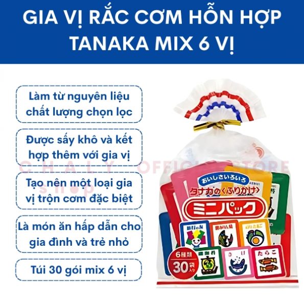 – Trong túi 30 gói gia vị trộn cơm hỗn hợp Tanaka gồm 6 vị: cá thu rong biển, cá ngừ nướng mirin, trứng và rong biển, rong biển iso nori, cá hồi và trứng cá tuyết
