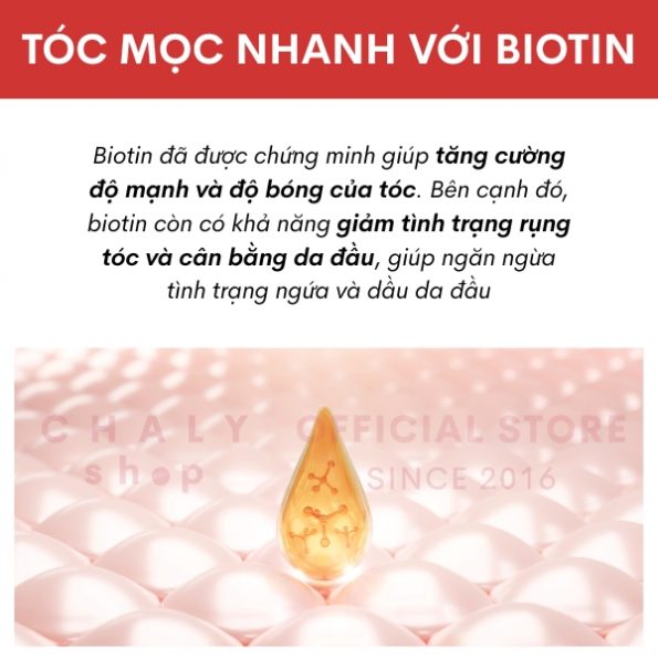 + Biotin: giúp nuôi dưỡng nang lông tóc, hỗ trợ và kích tóc mọc nhanh, chắc khỏe từ gốc tới ngọn
