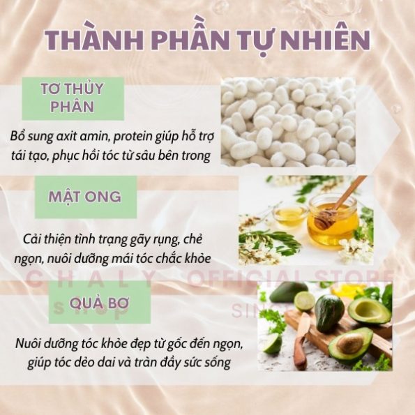 – Chứa các thành phần tự nhiên chiết xuất từ hạt quả bơ, lụa thuỷ phân và mật ong