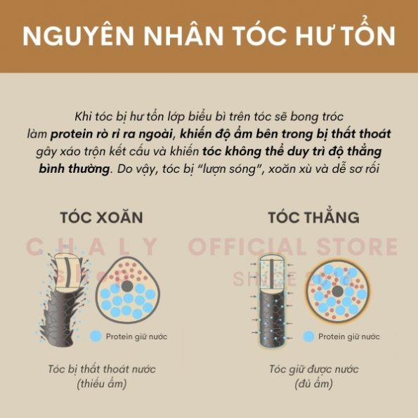 – Khi tóc bị hư tổn lớp biểu bì trên tóc sẽ bong tróc làm protein rò rỉ ra ngoài, khiến độ ẩm bên trong bị thất thoát gây xáo trộn kết cấu và khiến tóc không thể duy trì độ thẳng bình thường. Do vậy, tóc bị “lượn sóng”, xoăn xù và dễ sơ rối