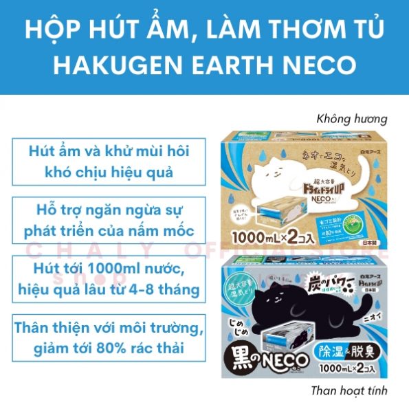 Shop Nhật Chaly cam kết cung cấp sản phẩm hộp hút ẩm, khử mùi ngăn tủ Hakugen Earth Neco 1000ml Nhật và nhiều sản phẩm hóa mỹ phẩm nội địa Nhật chính hãng 100%. Quý khách có thể đặt mua bằng các cách sau