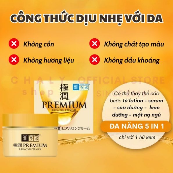 – Kem Hada Labo premium gokujyun hyaluron cream màu vàng là kem đa năng, thay thế cho sản phẩm serum cấp ẩm chuyên sâu + sữa dưỡng + kem dưỡng + mặt nạ dưỡng da