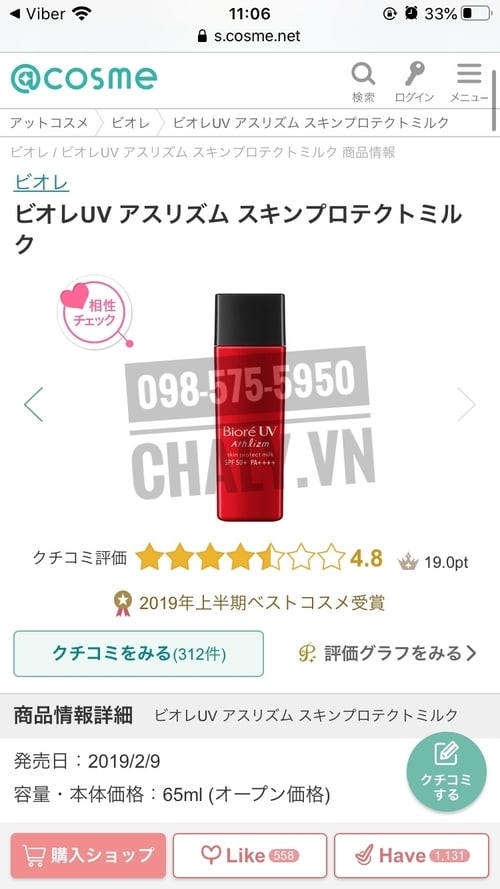 – Lọt top kem chống nắng bán chạy nhất ở Nhật năm 2018, 2019 theo bình chọn người dùng