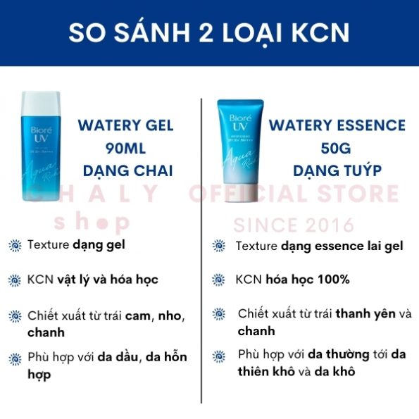 – Kem chống nắng Biore UV Aqua Rich Watery Essence là kem chống nắng hóa học 100% trong khi Biore Aqua Gel là dạng lai giữa vật lý và hóa học. Dạng gel sẽ làm da sáng hơn chút sau khi thoa xong