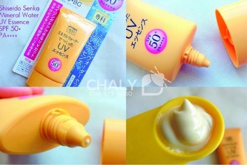 Nếu như chai kem chống nắng Shiseido màu xanh mineral water gel Nhật có texture dạng sữa thẩm thấu nhanh cùng thành phần powder dưỡng da giúp kiềm dầu hiệu quả, thì kem chống nắng Shiseido Senka màu vàng UV essence (専科 ミネラルウォーターでつくったUVエッセンス) có kết cấu dạng tinh chất sệt