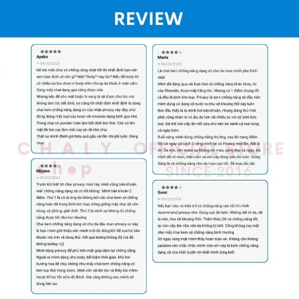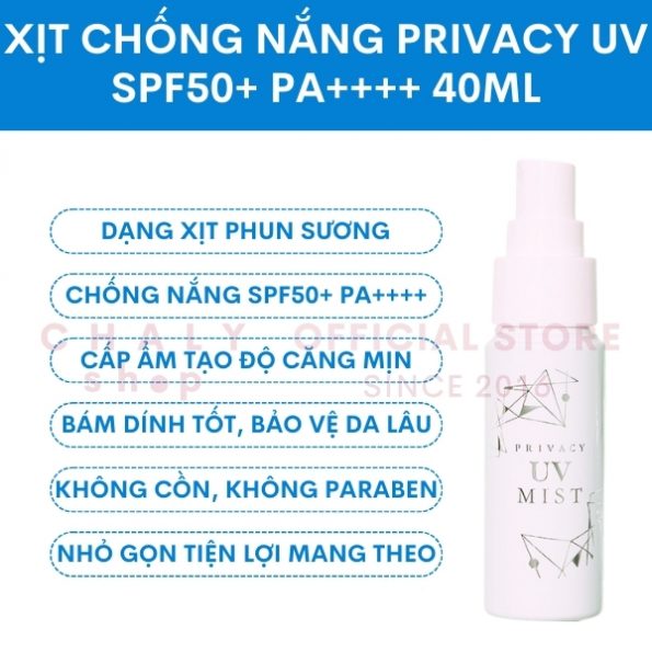 – Bởi vậy, sau khi tìm hiểu thì Chaly thấy xịt Privacy chính là kem chống nắng dạng xịt tốt nhất mà giá thành vừa phải, xứng đáng để shop giới thiệu các bạn sử dụng