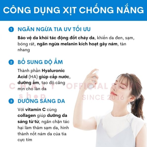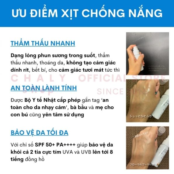 – Mục đích sử dụng: Kem chống nắng dạng xịt của Nhật bảo vệ da với chỉ số SPF50+ và PA++++. Đồng thời có khả năng cấp ẩm như 1 chai xịt khoáng. An toàn cho da nhạy cảm và bà bầu