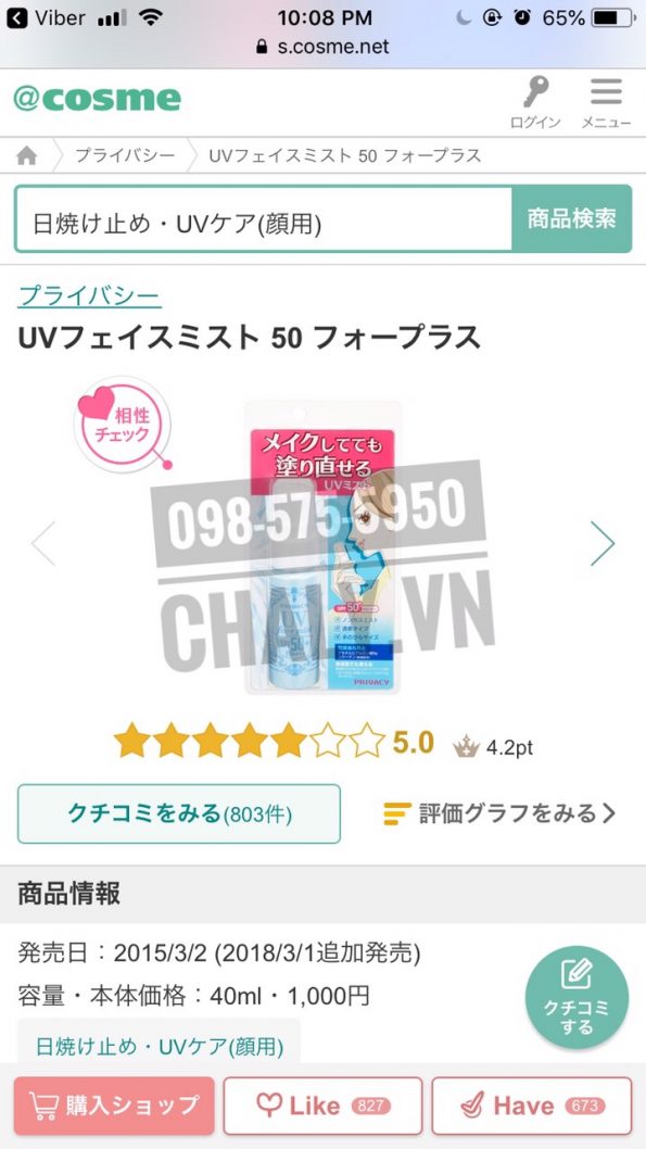 – Có thể coi như xịt chống nắng tốt nhất của Nhật hiện nay cho da nhạy cảm, dễ kích ứng, Privacy UV face mist SPF50+ được review siêu cao 5.0 trên Cosme Ranking với hơn 800 đánh giá