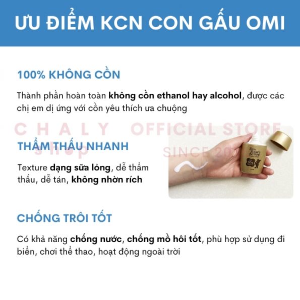 – Ưu điểm mà chống nắng Omi Nhật được yêu thích nhất chính là thành phần không cồn. Đây là một điểm cộng khá lớn bởi rất hiếm có thể tìm được chai kem chống nắng nội địa Nhật nào hoàn toàn không chứa cồn ethanol hay alcohol trong thành phần. Do đó, kem chống nắng con gấu được chị em dị ứng với cồn yêu thích