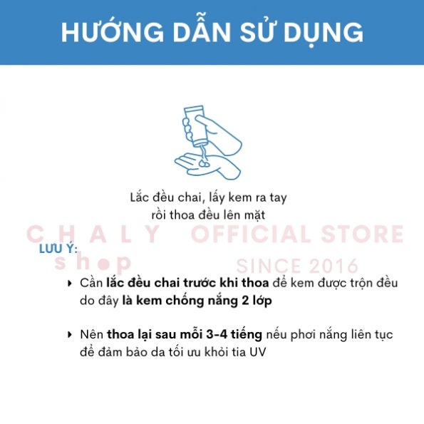 – Mục đích sử dụng: Chống nắng, bảo vệ da khỏi tia UV, đồng thời cấp ẩm dưỡng da