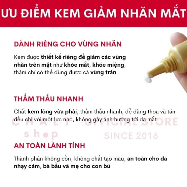 Tóm lại kem dưỡng mắt này còn có tác dụng tốt với việc dưỡng ẩm, trị kích ứng đỏ da, khô da cho không chỉ mắt mà cả khóe miệng và khóe mũi nữa.