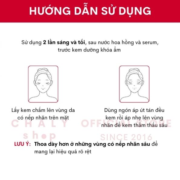 – Mục đích sử dụng: Đặc trị nếp nhăn vùng mắt và khóe miệng. Dưỡng ẩm mắt, chống lão hóa