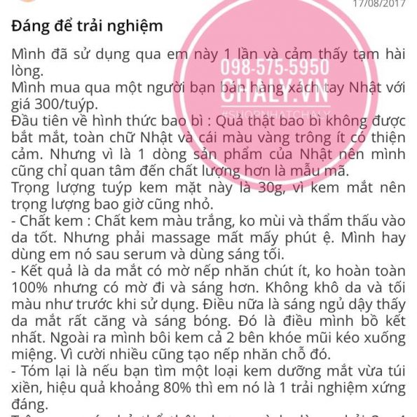 Mình đánh giá đây là sản phẩm kem chống nhăn mắt có độ dưỡng ẩm tốt.
