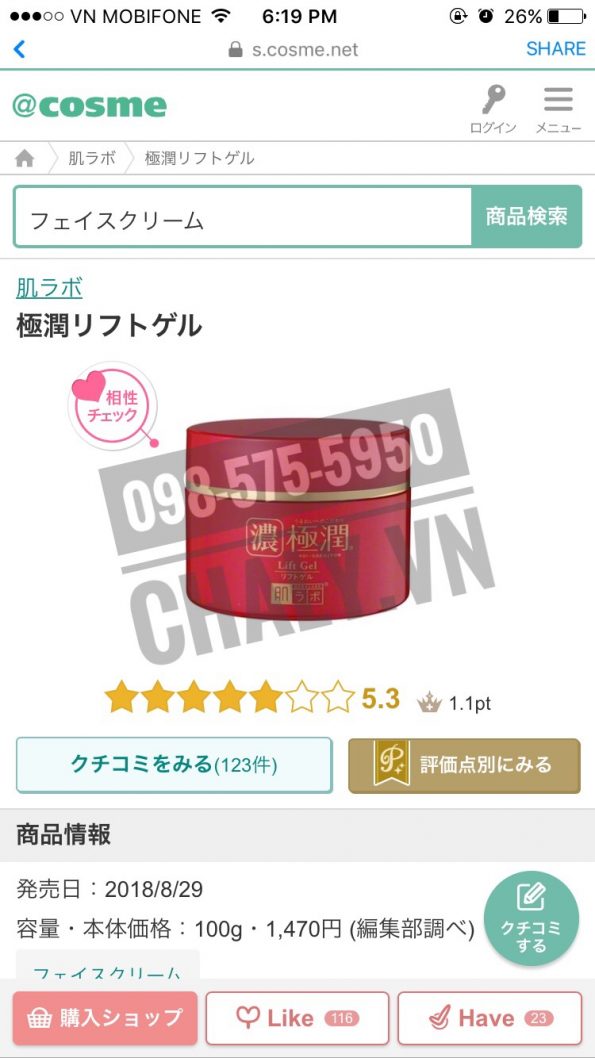Kem all in one Nhật Hada Labo v lift cream được review tới 5.3 trên Cosme Japan của Nhật