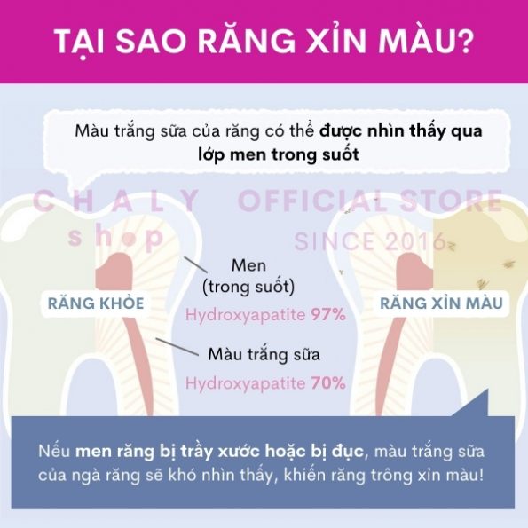– Thành phần chính của men răng là nước, protein và hydroxyapatite. 3 thành phần này chiếm tới 97% cấu tạo men răng