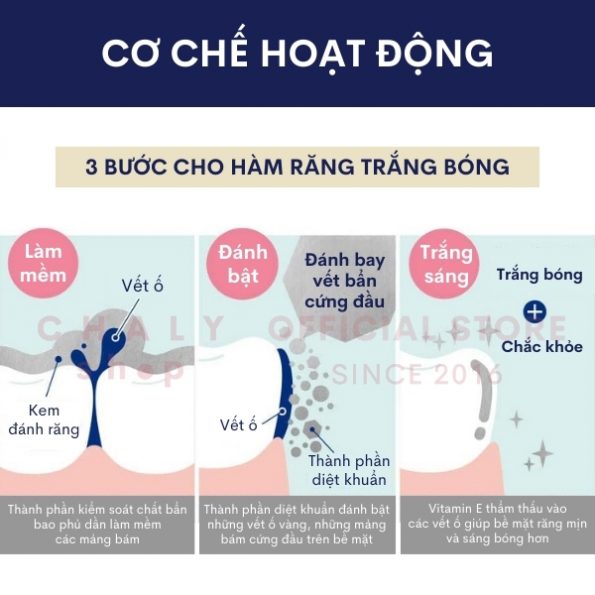 + Shiny white giúp loại bỏ các mảng bám và các vết ố vàng trên răng để cho răng luôn được trắng sạch